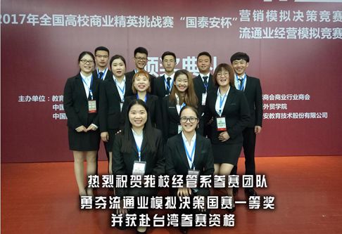 日前,我校经管系两支参赛队伍在指导教师李依璘老的带领下赴福州参加2017年全国高校商业精英赛流通业经营模拟大赛全国总决赛,以罗新为总经理的“五彩菠萝蜜”和以阿木以打为总经理的“智勇队”均获得全国一等奖,其中“智勇队”在冠亚季军争霸赛中,进入了全国八强的行列,获第五名,取得我校参加该项赛事以来的历史最好成绩,“五彩菠萝蜜”和“智勇队”均获得入围台湾赛海峡两岸流通业经营模拟大赛的资格。