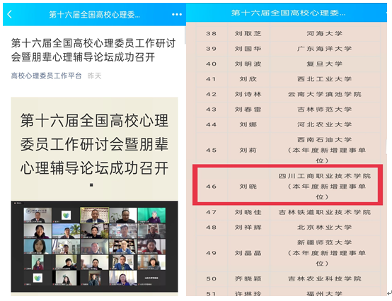 2021年11月16日至19日,由中国心理学会心理危机干预工作委员会、全国高校心理委员研究协作组主办的第十六届全国高校心理委员工作研讨会暨朋辈心理辅导论坛因疫情影响在线上举行。本次大会有来自国内外的心理专家和全国200余所高校的心理健康教育工作者参与。经过前期的申请、线上的答辩,我校从73所参选高校中脱颖而出,成为了今年38个入选2021年度全国高校心理委员研究协作组新增理事单位之一,刘晓老师当选全国高校心理委员研究协作组理事。