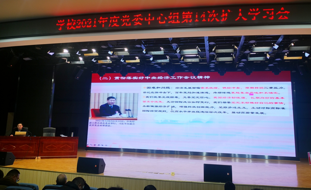 12月27日,我校在多功能二厅召开第14次党委理论学习中心组(扩大)学习会,学校领导、中层干部、各党总支(直属党支部)书记、党代会代表、离退休代表及正高级专业技术人员参加会议,党委书记管永林主持会议并领学中央、省委经济工作会议精神和省委十一届十次全会精神。