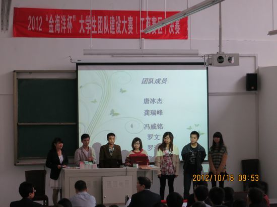 10月16日上午,2012“金海洋杯”大学生团队建设大赛(工商赛区)决赛在我院J1C103举行,下午举行了大赛的颁奖典礼,本次大赛完美落幕。