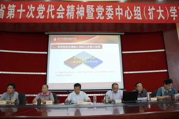 黄天贵副书记率先做了“学习贯彻四川省第十次党代会精神,举全院之力争创省级示范高职院校”的主题发言。黄书记首先强调,要将学院的发展融入到四川发展的大格局之中。黄书记指出,明确学院发展方向、实现学院科学发展是学习贯彻省第十次党代会精神的具体体现;学习贯彻省第十次党代会精神,实现学院科学发展,需要我们机制体制创新,需要我们抓住“人”这个根本,需要我们对照四川产业格局,着力打造重点和品牌专业,需要我们着力保障和改善民生,让全院师生更有幸福感、安全感。
