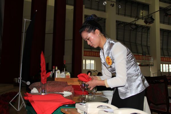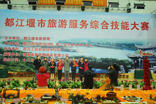 下午的四川工商职业技术学院素质拓展馆彩球高悬、热闹非凡,为期7天的都江堰市旅游服务综合技能大赛在这里举行隆重的闭幕式。由我院协办的本次大赛,吸引了来自都江堰市旅游服务行业的近5000名选手们分为前厅组、客房组、餐饮组、景区讲解组、厨师组,参与了客房服务、餐厅和前厅服务、景区讲解、酒店厨师厨艺等五个项目的激烈角逐,显示出该市旅游服务行业从业人员良好的技能水平。学院院长肖和平出席大赛闭幕式并为获奖选手颁奖。