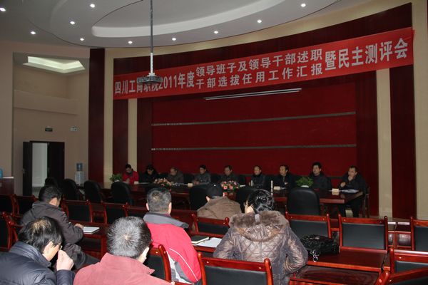 下午,学院在行政楼一楼会议室召开2011年度领导班子及领导干部述职、干部选拔任用工作汇报暨民主测评会。出席会议的有:全体院领导及中层以上干部、系主任助理、副高以上职称代表、民主党派、无党派、政协委员代表。大会由党委副书记、纪委书记黄天贵主持。