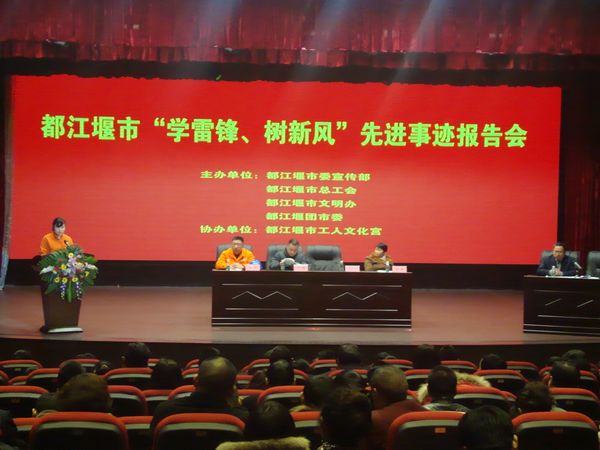 下午2时整,整个讲座现场座无虚席,报告会也拉开帷幕。都江堰供电局共产党员服务队队长、首届“都江堰好人”周坚,都江堰中学教师、首届都江堰好人叶强,西部志愿者、社工协会郭美玲,残疾人爱心服务站的黄莉等先进人物各自作了报告。他们分别结合自己的亲身经历,讲述了如何在不平凡的岗位上弘扬雷锋精神,努力实现自我人生价值。积极倡导广泛开展各种“学雷锋”活动,让青年志愿者服务走进社区,送温暖给留守儿童和孤寡老人。他们是近年来都江堰市涌现出来的学雷锋先进典型的代表,每个人的事迹都从不同角度不同层面展示了各自崇高思想境界和道德风貌。他们的感人事迹深深地打动了在场的每一位听众。