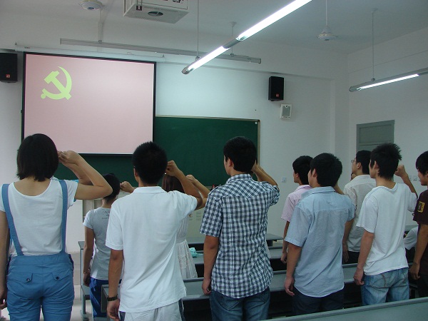 活动由系学生党支部书记李扬颖老师主持。在庄严隆重的国歌之后,面对鲜红的党旗,党总支副书记任煛带领新发展的12名预备党员,举起右手,庄严宣誓,响亮而又坚定的誓言在教室久久回荡。接着,预备党员代表郭小凡同学代表所有预备党员发言,表示将牢记使命,履行承诺,做学生榜样,做群众表率,以优异的成绩向党组织汇报。