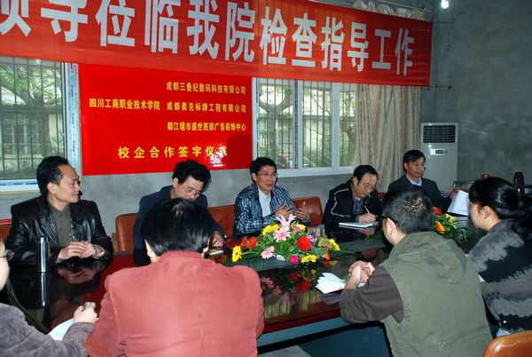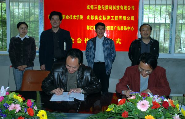 4月20日上午,我院设计艺术系校企合作签字仪式在学院本部会议室举行,成都三叠纪数码科技有限公司、成都奥克设计有限公司、都江堰盛世西部广告装饰中心三家企业总经理与学院院长肖和平、副院长徐时彬、岳文喜以及设计艺术系负责同志参加了签字仪式。会上肖和平院长、徐时彬副院长和成都奥克设计有限公司唐世余总经理、成都三叠纪数码科技有限公司李洪冰总经理、都江堰盛世西部广告装饰中心设计谢发强总监、设计艺术系庞映平书记分别作了讲话。