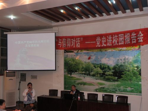 黄书记报告分三部分:一是中国共产党90年的奋斗历程;二是九十年的历史启示;三是继往开来是当代青年的历史使命。在报告中,黄书记指出,中国共产党九十年的历史,是中国共产党为民族独立和人民解放而前仆后继、英勇奋斗的历史,是中国共产党为实现国家繁荣富强和人民共同富裕而不懈努力的历史,是中国共产党把马克思列宁主义普遍原理同中国革命、建设和改革的具体实际经过反复实践而愈益结合的历史,也是中国共产党不断加强自身建设,始终保持党的先进性,从而领导中国革命、建设和改革不断取得胜利的历史。九十年来的历史启示告诉我们,我们党之所以领导全国人民不断取得革命、建设和改革的胜利,归结到一点,就是把马克思主义基本原理同中国具体实际相结合,探索自己的革命、建设和改革道路。最后,黄书记希望同学们坚定信念,永跟党走,努力在砥砺品德中发展,在学习中进步,在创新中提高,在实践中成长,在奉献中升华,担当起继往开来的历史使命,不断创造无愧于时代、无愧于人民、也无愧于自己的新的青春业绩!让青春在建设中国特色社会主义的伟大事业中焕发出更加绚丽的光彩!