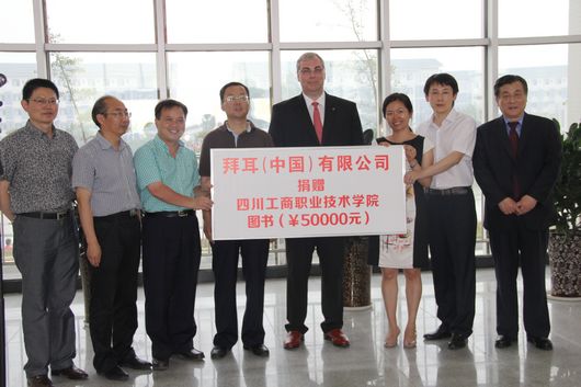 下午4时,拜耳(中国)有限公司图书捐赠仪式在学院图书馆大厅举行。学院党委孙培生书记、德国拜耳集团大中华区徳友汉总裁在捐赠仪式上先后致辞。孙培生书记对拜耳集团对学院抗震救灾和重建过程中给予的无私援助表示衷心的感谢,并高度评价了拜耳集团热心公益、勇于承担企业公民责任和义务的良好社会形象。徳友汉先生对学院能在短短时间重建美丽新校园表示钦佩,并祝愿同学们前程似锦、老师们桃李满天下、学院明天更美好。随后,徳友汉先生代表拜耳(中国)有限公司向我院捐赠五万元图书,孙培生书记代表学院接受了捐赠。
