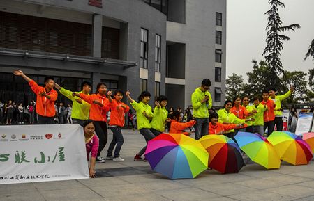 随着《我相信》的动感音乐,身着明亮色彩服装的心理协会的同学们从小广场两侧迅速集结到一起开始快闪表演。同学们整齐划一的动作、自信阳光的笑脸立刻吸引了很多老师和同学们到场围观。欢快、激昂的开场曲之后,《隐形的翅膀》如一首轻柔的诗歌娓娓道来,婉转的旋律传递了不论遇到什么困难都要相信自己、勇往直前的坚毅与力量。一首《我的未来不是梦》则将全场的氛围推向了高潮,同学们活力四射的舞蹈和深情并茂的演唱,将对未来的憧憬、勇敢乐观的心态展现无遗。最后,同学们打开“走向心世界 传递正能量”的横幅, 而这正是今年我院5.25心理健康月的主题。