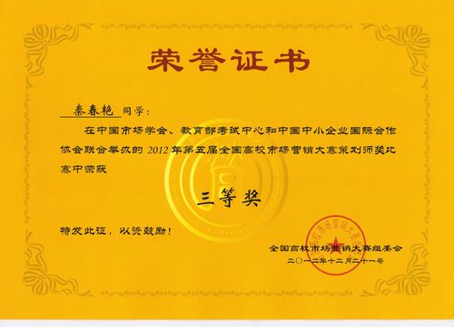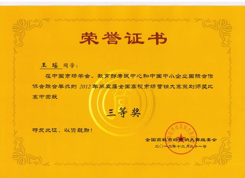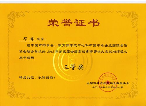 这是管理系继TOP-WE团队荣获第五届全国高校市场营销大赛团队竞赛三等奖之后,在个人单项奖方面获得的又一成绩。此项比赛面向全国大学生,要求以娃哈哈企业或者产品为对象撰写营销策划方案。评比标准主要包括策划方案结构的完整性、策略的创新性以及可行性等几个方面。通过近两个月的比赛作品征集和严格的作品评选,全国共有32名同学获得此项奖励,其中四川省共有5名同学获奖。本届比赛给了同学们一个良好的锻炼营销策划方案撰写能力的机会,起到了良好的以赛促学的效果。