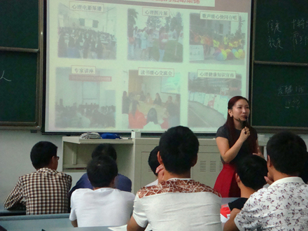金秋九月,伴随着新学期的带来,我院迎来了2014级的大一新同学,为了让大一新生们更好更快的跨越高中到大学的分水岭,尽快适应大学的学习和生活,922日至928日,我院心理健康教育中心的王正莉、周婷、刘晓、邓勇、李丹丹五位老师为我院2014级的新同学们开展了主题为《打开心灵的窗户》入学心理健康教育讲座。