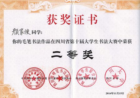 四川省第十届大学生书法大赛已正式落幕,颁奖典礼在四川大学(江安校区)举行。我院学子颜家俊荣获毛笔书法作品二等奖。