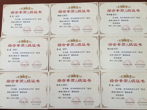四川省大学生“综合素质A级证书”是全省大学生综合素质的最高认证,由共青团四川省委、四川省学联共同设立的,旨在引导青年学生积极向上、奋发成才、全面发展,对于培养具有学习能力、实践能力、创新能力的综合型人才等方面起到了积极的推动作用,也得到了社会的广泛认可。