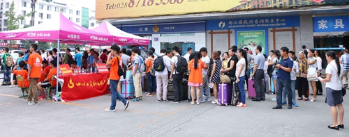 此次新生接待的志愿服务工作仍涵盖都江堰市客运中心、快铁站以及校内三个点。在迎新工作中,我校往返快铁站与客运站的迎新接待车高达百余次。负责校外志愿服务的同学们始终坚守迎新工作第一线,早晨7:30他们就已经在各个接待点就位,等候出站的各位新生与家长,及时解决新生遇到的困难和问题。