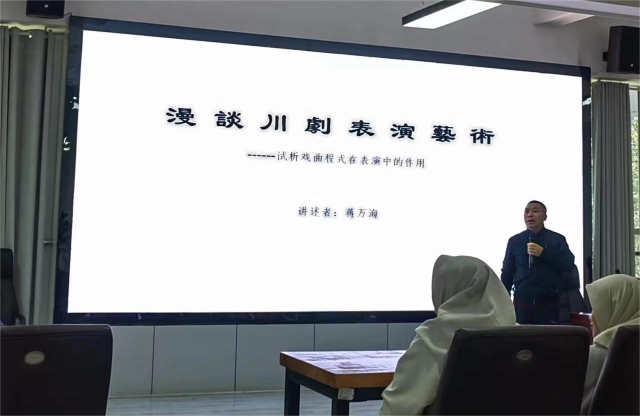蒋万海教授首先向留学生们介绍了川剧的历史渊源、艺术特点和表演形式。他生动有趣的讲解,让留学生们对川剧有了初步了解,并产生了浓厚兴趣。