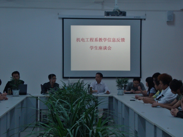 下午,机电工程系召开了2011-2012学年第2学期前半期教学信息反馈学生座谈会。机电系负责人、教学干事、学生干事、团学会秘书处及各班班长、团支书、学习委员参加了本次会议。会议由机电系党总支副书记张思杨主持。