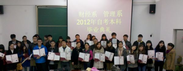 3 月15日 下午,财经系与管理系联办的2012年自考本科毕业典礼在J1B106教室隆重举行。财经系系主任杨柳、党总支副书记聂文俊出席了此次典礼。首先,聂书记对在场的毕业生们表示了衷心的祝贺。接下来,杨主任对同学们不懈的努力与追求做了充分的肯定,对他们的未来寄予殷切的期望。最后,大家合影留念。会场洋溢笑容和喜悦,掌声不断。一份耕耘,一份收获,同学们表示:他们将以毕业生为榜样,好好学习、奋力拼搏,用自己的努力创造崭新的未来。