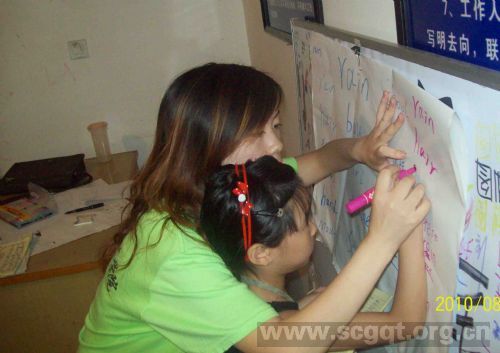 8月10日上午,“三下乡”服务队迎着清晨的阳光,再一次来到滨河小区。今天我们的主要任务是要让小区的小朋友们学会用英语认识水果,并给小朋友们讲解水果的营养价值及健康食用。 当我们服务队还未到达小区教室时,小朋友们已经早早地在门口等候着。当教室们一打开,他们争先恐后,表现出一种积极求学的态度。上午9:00,今天的活动正式开始。服务队副队长侯美伶首先收取昨日的家庭作业,并一一评改;然后请了一些作业典型小朋友上黑板写出单词,让小朋友们找到错误的地方,并对这些错误单词再一次进行讲解;最后侯美伶同学就以昨天课程所学的单词和小朋友们进行了互动游戏,对所学单词开展接龙游戏,把单词的组成及读法在小朋友们的头脑中扎根,让小朋友们在快乐中学习知识。