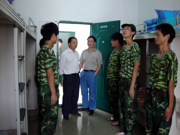 9月3日下午,管理工程系主任蔡登火、党总支副书记聂文俊一行前往我院西区看望军训新生。在辅导员们的带领下蔡主任和聂书记到寝室与同学们进行了深切交谈,不时询问并关心同学们的军训情况和身体状况。在交谈中,蔡主任和聂书记告诉同学们,要调整好军训的心态,要有吃苦的心理准备,不抛弃不放弃,坚持军训到最后一刻。同时,还针对一些同学在军训中需要注意的问题进行了讲解。在老师们的鼓励后,管理工程系2010级的同学们纷纷表示一定认真参加军训,并希望能在军训中有所收获。